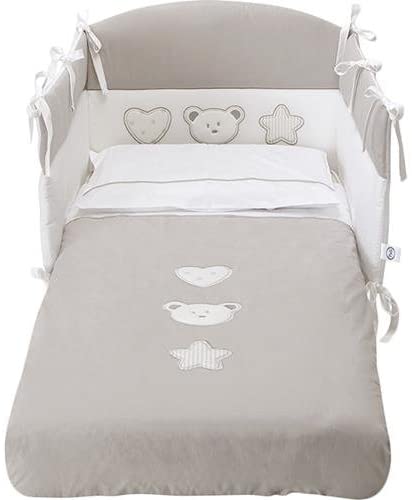 Rivestimento in 100% cotone con interno in bra di poliestere arricchito da tessuto stampato personalizzato ed applicazioni in tessuto ricamato. Il set comprende: paracolpi sagomato, piumone slabile (cm 75x125) con copripiumone e federa cuscino (cm 60x40)
