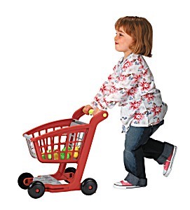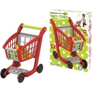 Carrello della spesa dotato di ruote in plastica facili da spostare e di un cestino. Modo divertente per imitare l'azione di fare la spesa a casa. 12 pezzi di prodotti del supermercato.