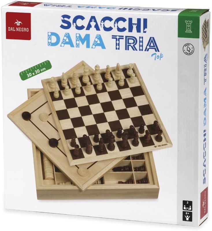 Il classico gioco degli scacchi, dama e tria. Una confezione tre giochi per divertirsi con gli amici e la famiglia. Prodotto in legno. Un pratico contenitore 30x30x5 cm al cui interno si trova un set scacchi, un set pedine per dama e tria, un libretto con le regole dei giochi.