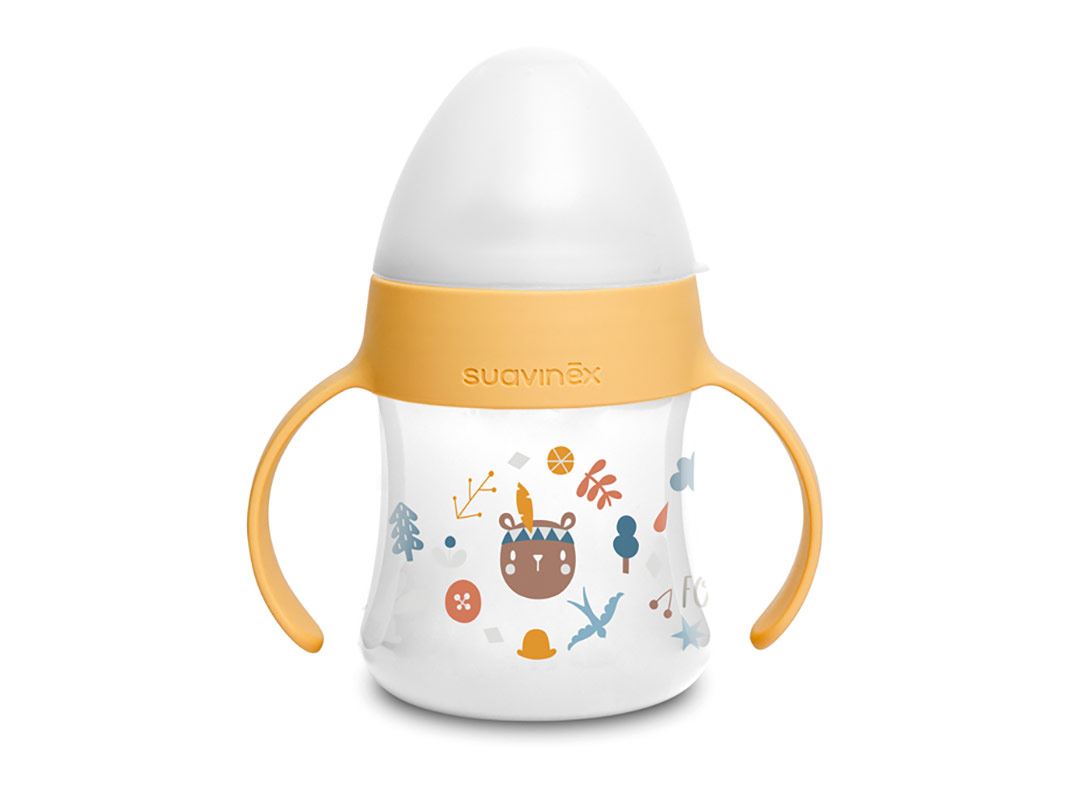 Facilita il passaggio dal biberon alla tazza. Dotato di morbida tettarella in silicone e manici per una presa facilitata.