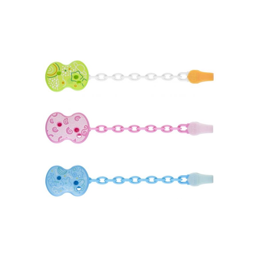 Clip con catenella, facile da agganciare ai vestitini, sterilizzabile a caldo e a freddo. Gancio morbido al succhietto. Disponibili diversi modelli venduti singolarmente