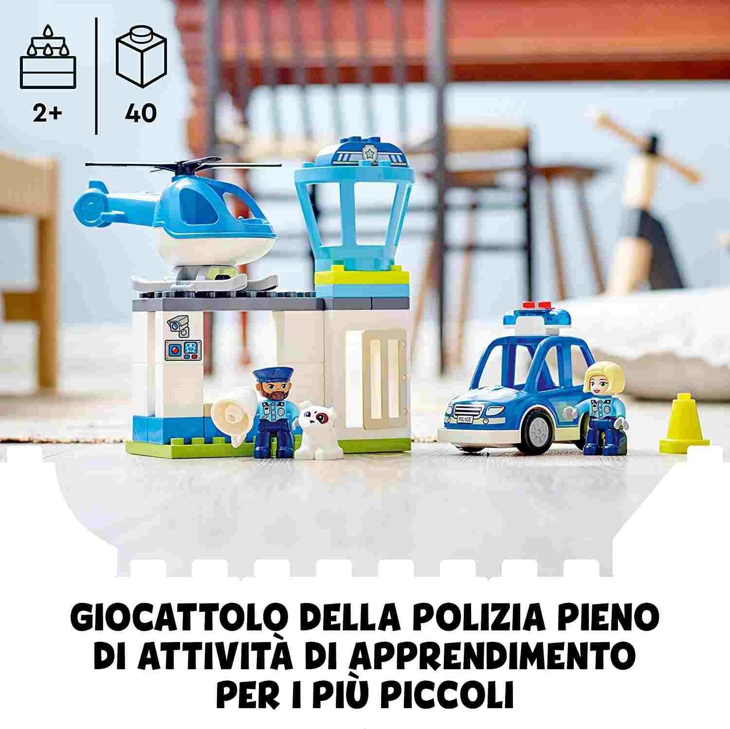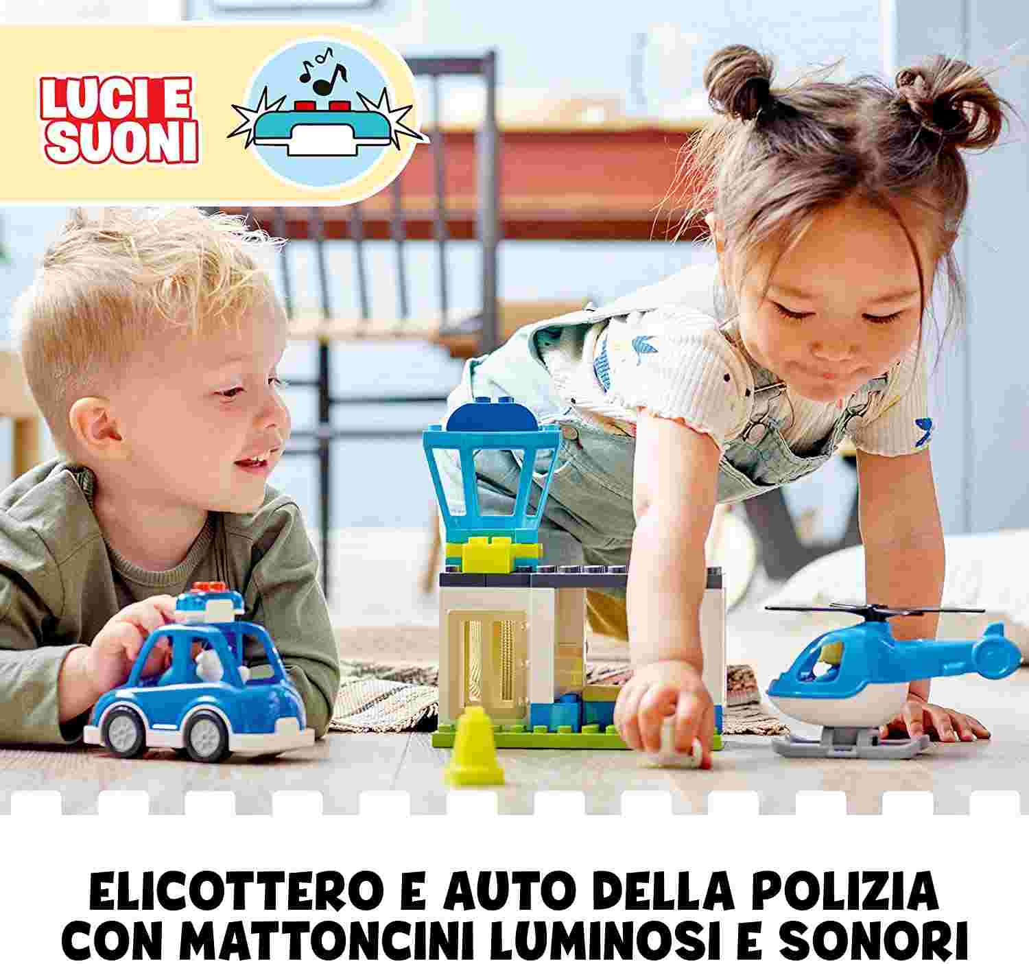 Playset che include una torre di osservazione, un'auto della polizia con carica a molla, luci e sirena più un elicottero giocattolo