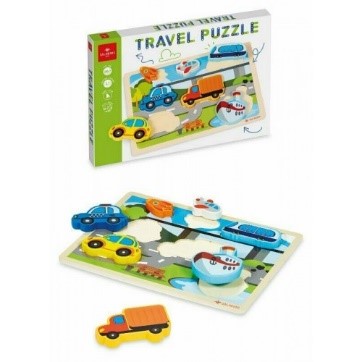 Travel Puzzle, il puzzle in legno con veicoli sagomati che facilitano il bambino a riconoscere i mezzi di trasporto cercando la forma corretta in cui posizionarli. Sviluppano la percezione visiva e stimolano la coordinazione occhio-mano.