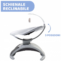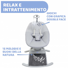Il sedile si muove in diverse direzioni, creando cosi 8 diversi movimenti oscillatori: Dondolino, Coccole, A passeggio, Post pappa, In macchina, Relax, A cavallo, Intrattenimento. Divertimento in musica: 15 melodie che richiamano i suoni della natura per allietare i diversi momenti della giornata. Schienale reclinabile in 3 posizioni, per il massimo comfort durante l'utilizzo.