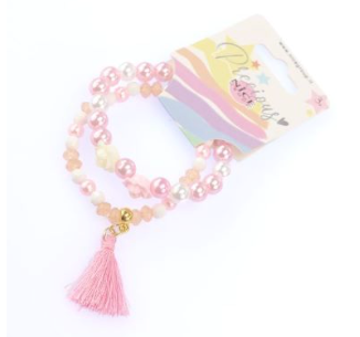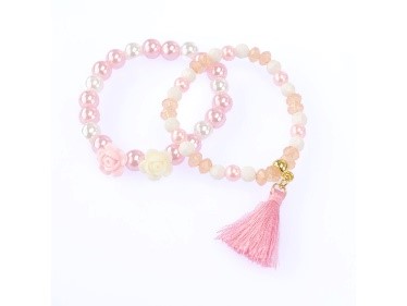 Set di due bracciali. Perline e rose. Incluso un pon pon.