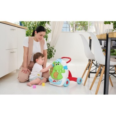 Un dolce dinosauro come girello 2 in 1: primi passi e centro attività elettronico con incastri per le formine. Le quattro grandi ruote supportano il bambino consentendogli di muovere i primi passi.