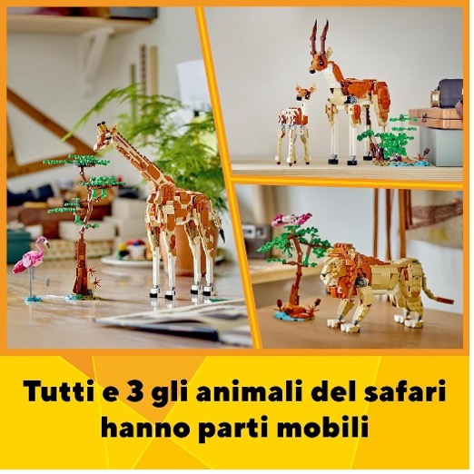 Il set permette di costruire diversi animali giocattolo per bambini, tra cui una giraffa dal lungo collo dotata di gambe, coda e collo snodabili, posizionata vicino a un piccolo albero insieme a un fenicottero rosa. Poi è possibile costruire 2 gazzelle (dotate di parti snodabili) con 2 cespugli, oppure un leone LEGO con un albero e una farfalla giocattolo.