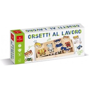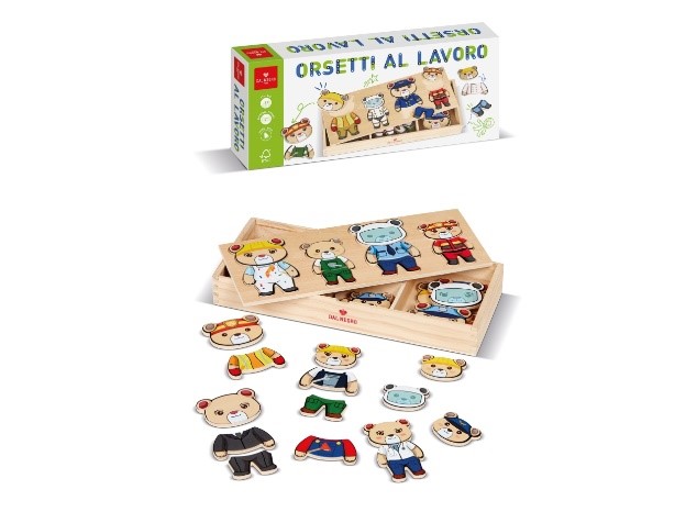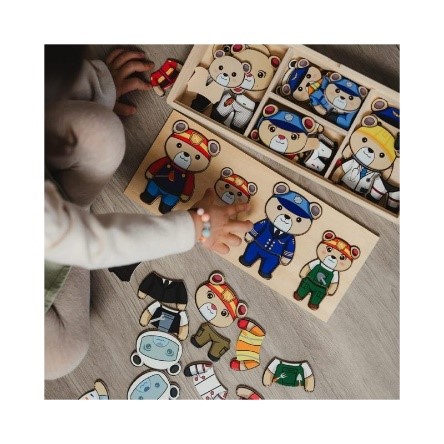 Scopri tante professioni affascinanti abbinando le diverse divise alla famiglia degli Orsetti. Contenuto confezione: 1 contenitore con piano di gioco sagomato in legno e 72 pezzi in legno per comporre i personaggi.