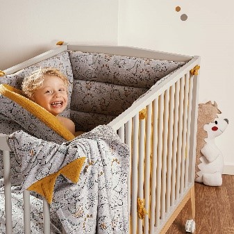 Linee essenziali, arredi versatili e tessuti in puro jersey di cotone. Sono queste le caratteristiche della collezione Dino. I colori, che spaziano da varie tonalità di grigio fino al senape e al bianco, accompagnati da un delizioso motivo a dinosauri, si adattano facilmente anche all’arredamento della camera di mamma e papà. 100% Made In Italy.