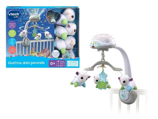 La giostrina dolci pecorelle di VTech è una giostrina luminosa e musicale che culla e calma il tuo bambino! Le proiezioni colorate sul soffitto , tre pecorelle in tessuto e due stelle rimovibile attirano l'attenzione e stimolano il senso visivo del tuo bambino.Inoltre, i suoni della natura, i rumori bianchi e le dolci melodie stimolano il senso dell'udito del tuo piccolo e aiutano a cullarlo e ad accompagnarlo nel mondo dei sogni. Inoltre la giostrina può essere controllata a distanza grazie a un telecomando incluso per non disturbare il bambino mentre dorme.