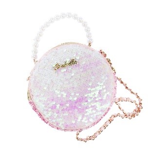 Una borsa pochette tonda con chiusura zip, maniglia superiore e tracolla.