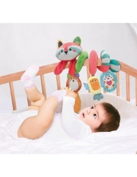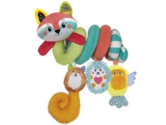 Il simpatico procione e i suoi amici del bosco costituiscono una morbida spirale per il passeggino, per intrattenere e divertire il bambino grazie ai diversi materiali e ai sonaglini pendenti. Il simpatico scoiattolo ha una coda morbida con effetto croccante, il riccio e l'uccellino hanno un sonaglio all'interno. Stimola la destrezza manuale e la percezione visiva e uditiva.