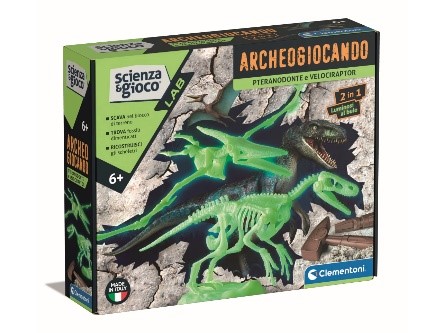 Con questo kit scientifico potrai scoprire i due temibili dinosauri pteranodonte e velociraptor. Scava nei blocchi di terreno per riportare alla luce i fossili. Divertiti a ricomporre le creature e osservale brillare al buio. La confezione contiene martello e scalpello per diventare un vero paleontologo