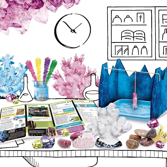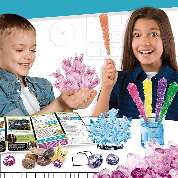 Un kit scientifico per creare tantissimi cristalli colorati. Potrai osservare i tuoi cristalli crescere velocemente sopra un corallo, come per magia!