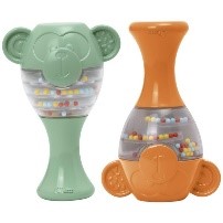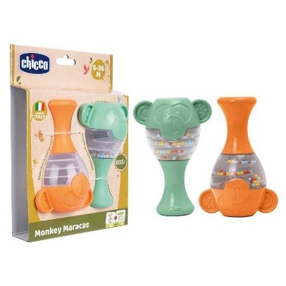 Due Maracas a forma di scimmia, facili da afferrare e scuotere per ascoltare gli effetti sonori. Realizzato in plastica riciclata. Scuotetele e capovolgetele per vedere i diversi percorsi che prendono le palline. Aiutano a sviluppare la coordinazione manuale e le capacità uditive.