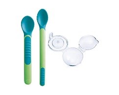 Posate per imparare a mangiare perfettamente funzionali. Impugnature antiscivolo e facile da tenere grazie alla sua forma ergonomica e sagomata. Adatte sia alla mano destra che alla sinistra. Punta sensibile al calore: cambia colore se la pappa è troppo calda. Con coperchio a due compartimenti per conservare il cucchiaio in modo igienico.