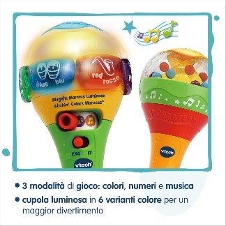 6 pulsanti luminosi e colorati per scoprire gli strumenti musicali e i colori.