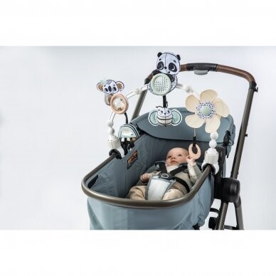 Arco Sunny Stroll in bianco e nero con 6 attività coinvolgenti e regolazione dell'angolazione, per divertimento e intrattenimento ovunque tu vada! Il giocattolo elettronico a forma di uccello riproduce 4 melodie diverse e può essere attivato dal bambino. L'arco si inclina facilmente verso il bambino. Puoi collegare facilmente l'arco al tuo passeggino, alla carrozzina o alla culla.