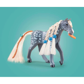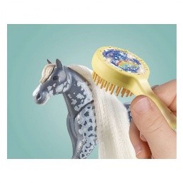Questo set include un magnifico cavallo, un dolce puledro, degli adorabili alpaca, vari accessori come attrezzatura da equitazione, una mangiatoia, una carriola e altro ancora.