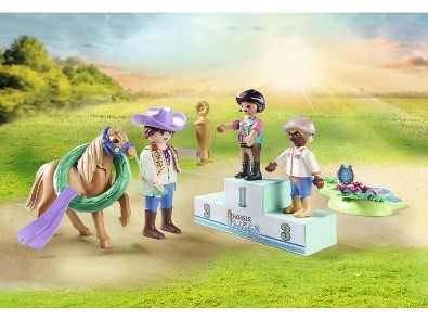 Questo set include 1 figura adulto, 2 figure bambino, 2 figure pony, 1 podio, 1 corona della vittoria pony, 1 trofeo d'oro, 2 pezzi di fieno, 2 caschi per le figure, 3 prove numerate e altri accessori di gioco, con i quali potrai ricreare uno scenario di gara. Divertiti con salti, piroette e molto altro, vinci il trofeo finale, ma soprattutto vivi un'avventura piena di sorprese e sfide.