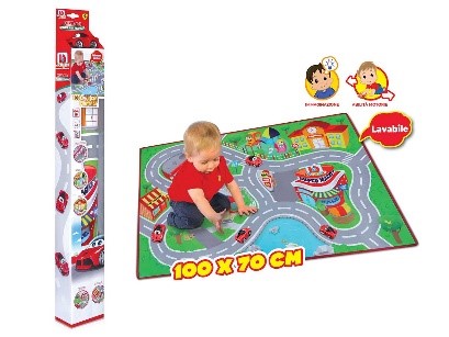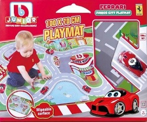 Tappeto 100 x 70 cm e un’ automobile Ferrari a ruote libere. È perfetto per giocare a terra, è resistente e leggero e facile da portare ovunque. La superficie è lavabile.