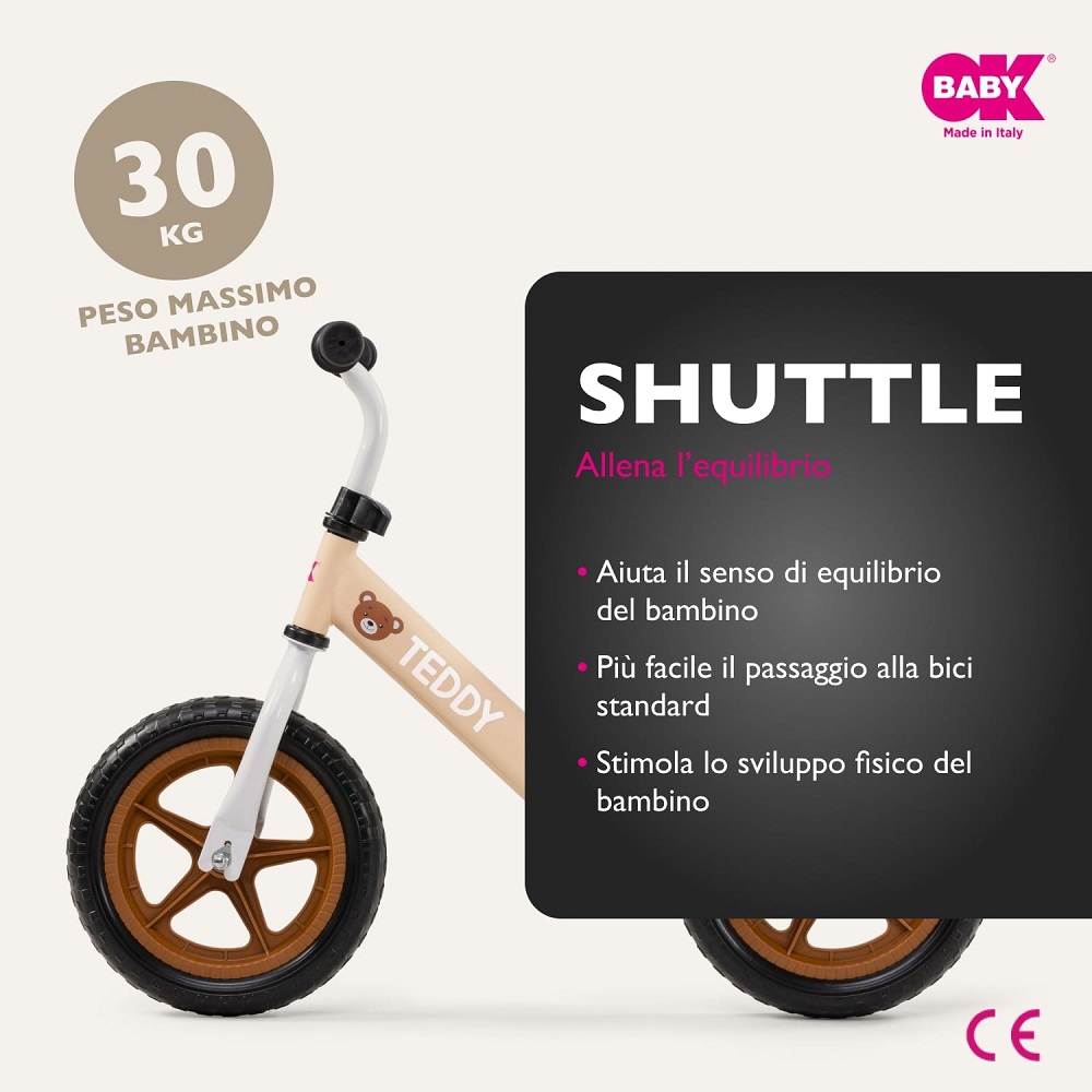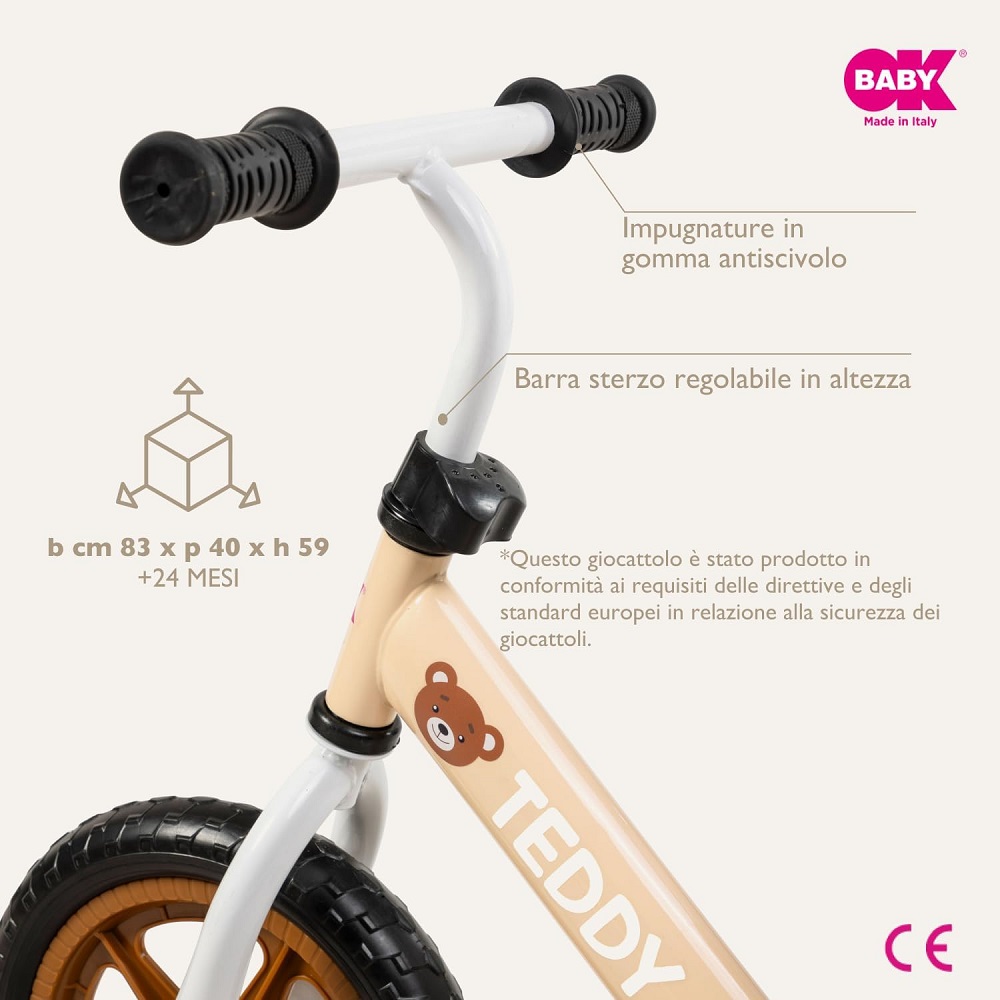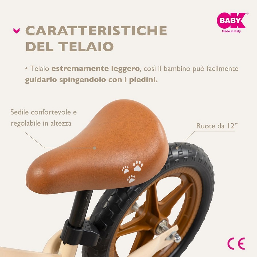 La bici Balance Bike di Ok Baby è un giocattolo ideale per sviluppare l’equilibrio, la coordinazione e la percezione della velocità del tuo bambino.