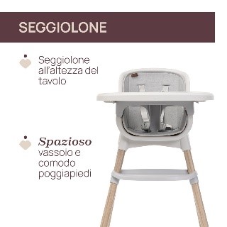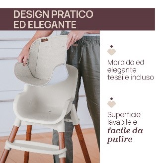 Seggiolone evolutivo 3in1: seggiolone, sedia per bimbi e sgabello per bambini. Stile contemporaneo con linee eleganti e design minimalista. Dotato di dettagli in legno sulle gambe e un elegante tessuto morbido per la seduta. Ultra-leggero e compatto, facile da spostare. Chiusura compatta con spazio per riporre il vassoio.