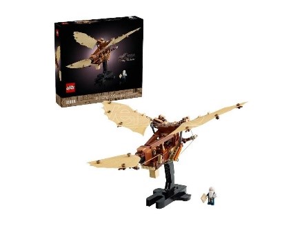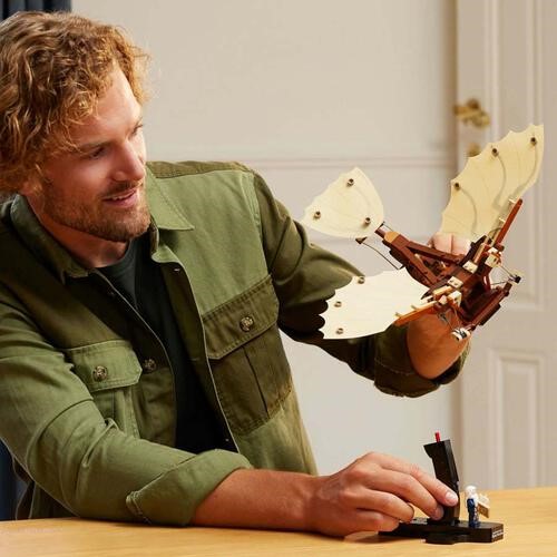 Set da costruzione LEGO Icons Macchina volante di Leonardo da Vinci per adulti. minifigure di Leonardo da Vinci. Premi il grilletto per far sbattere le ali e la coda tessili del velivolo.