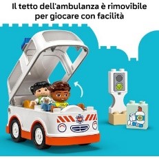 Questo set include l’autista dell’ambulanza e la bambina, un veicolo LEGO, una borsa e un kit di pronto soccorso. I bambini diventano eroi mentre corrono sulla loro ambulanza per aiutare la ragazza scivolata su una buccia di banana! Usando le loro esperienze nelle visite dal medico, possono immaginare cosa farebbe un vero paramedico per aiutarla, prendono il kit di pronto soccorso per prestare soccorso alla ragazza e poi l’aiutano a salire sull’ambulanza per portarla in ospedale.