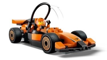 Questo piccolo veicolo ha il design super aerodinamico di un'auto da corsa di Formula 1® con pneumatici slick e include la minifigure del pilota della McLaren F1 .