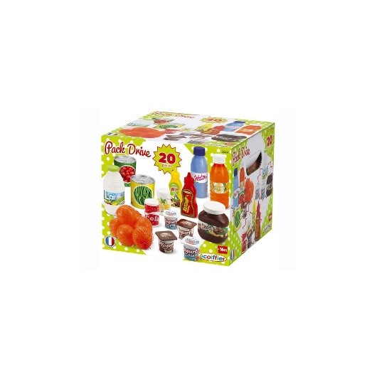 La confezione contiene 20 pz di finti generi alimentari per giocare a fare la spesa o a cucinare. Contiene ad esempio: vasetti di yogurt, lattine di bibite, vasetti e scatolame vario.