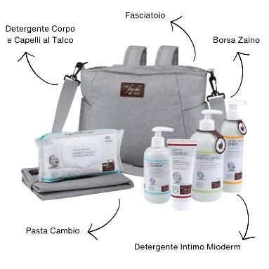 Il kit include diversi prodotti essenziali: il Detergente Intimo Mioderm Fiocchi di Riso, testato sulla mucosa vaginale e come trattamento coadiuvante per la pelle a tendenza atopica; la Pasta Cambio Fiocchi di Riso, testata in vivo per la sua efficacia protettiva e lenitiva; il Detergente Corpo e Capelli Talco, testato oftalmologicamente e pediatricamente; e la Crema Fluida Corpo Fiocchi di Riso, ideale per idratare la pelle delicata del bambino con azione prolungata fino a 24 ore.