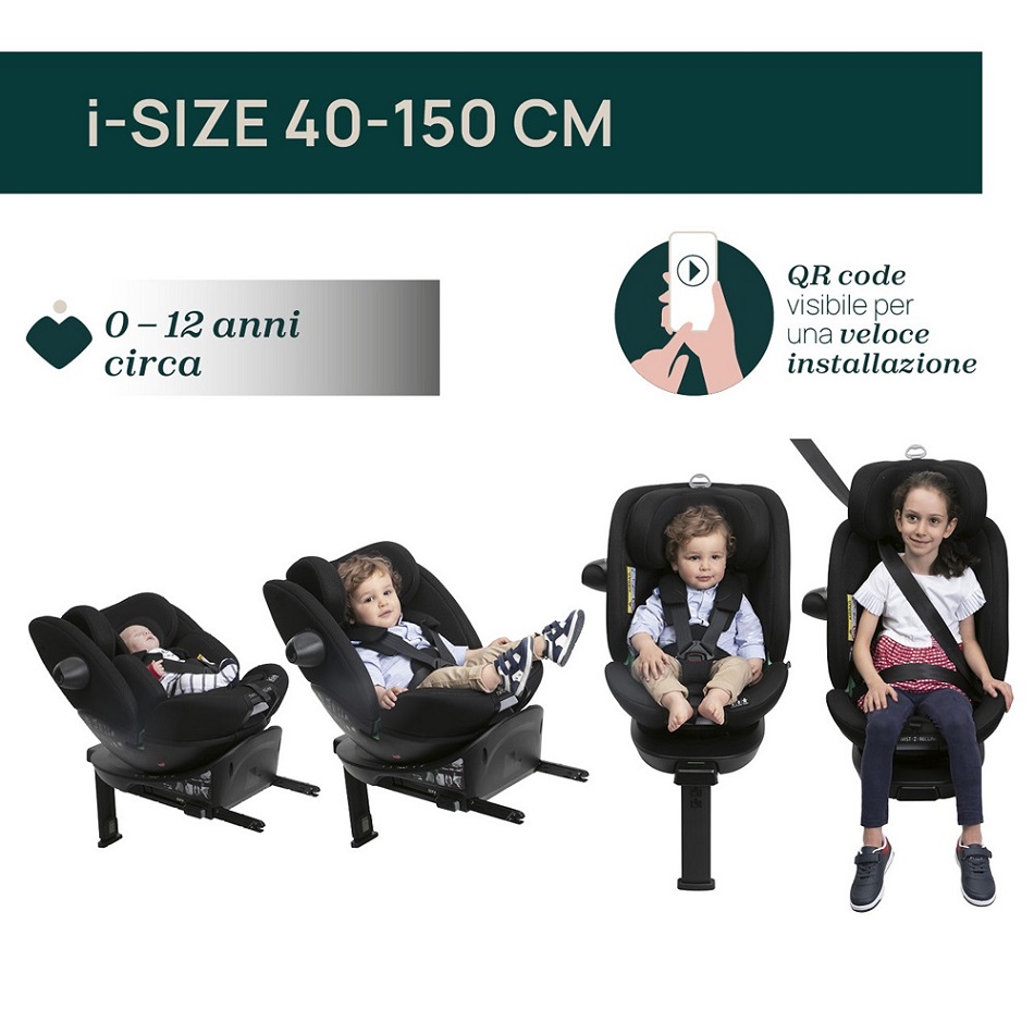 Il seggiolino Everone si trasforma per seguire la crescita del bambino, dalla nascita fino ai circa 12 anni d'età (altezza compresa tra i 40 e i 150 cm ; 0-36 kg). Facile da usare, grazie al sistema Twist-Recline. EverOne i-Size è un seggiolino auto universale: - FASE 1: installazione su neonati e bambini piccoli - FASE 2: installazione per bambini grandi Il sistema Twist-Recline permette di ruotare il seggiolino e di reclinarlo in 3 posizioni diverse con la stessa maniglia posizionata frontalmente, per per migliorare l'usabilità per il cliente. È possibile ruotare il seggiolino a 90° in posizione fronte genitore per posizionare facilmente il bambino e quindi ruotarlo in direzione posteriore o direzione di marcia.