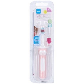 Impugnatura più corta, ergonomica e compatta: ideale per imitare i movimenti degli adulti. Testina rotonda, extra-morbida. Setole ideali per una pulizia delicata, dove le setole rosse indicano la quantità di dentifricio raccomandata. L'anello di sicurezza mantiene lo spazzolino a una distanza di sicurezza dalla parte posteriore della bocca del bambino. Sviluppato insieme a medici specializzati per bambini a partire da 6+ mesi.