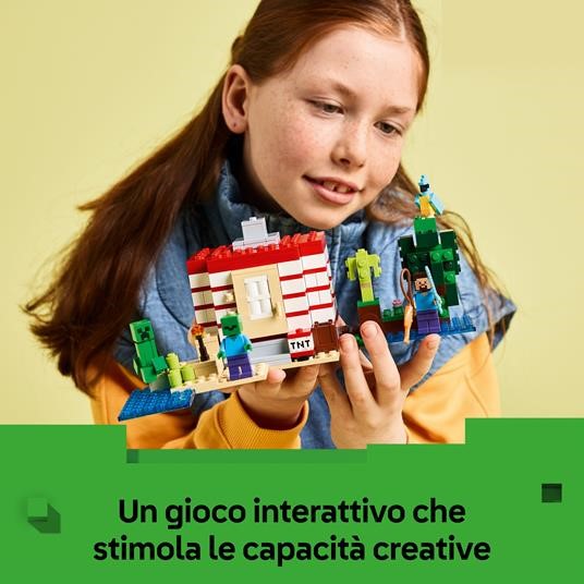 La casa costruibile è ambientata nel bioma della giungla di Minecraft e ha l’aspetto di una versione in grande scala dell’iconico elemento dinamite del gioco. Un interruttore laterale consente ai bambini di attivare la funzione della dinamite esplodente, che fa crollare l’intera casa. Quando le acque si calmano, i bambini potranno ricostruire la casa in modo che sia pronta per la loro nuova avventura. Le minifigure di Steve, del Creeper e dello zombie ispirano il gioco di fantasia e azioni di battaglia. Gli autentici accessori LEGO Minecraft includono una barca, una canna da pesca, un pesce, un pappagallo e il fogliame della giungla. L’app LEGO® Builder offre ai bambiniil divertimento aggiuntivo di utilizzare il proprio dispositivo per ingrandire e ruotare i modelli in 3D. Contiene 287 pezzi.