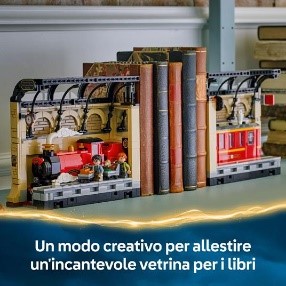 Porta la magia sugli scaffali dei bambini con il primo Book Nook LEGO Harry Potter (76450), contenente una sezione costruibile dell’Espresso per Hogwarts , un modo creativo per allestire un incantevole display con libro. Questo giocattolo magico consente ai bambini di ricreare le scene iconiche del Binario 9¾ di King’s Cross con le minifigure di Harry Potter e Ron Weasley e i personaggi LEGO dei loro animali domestici Edvige e Crosta. Il modello del treno include una locomotiva dettagliata e una carrozza con aperture laterali per l’accesso alle minifigure, e la carrozza ha specchi a un’estremità per creare l’illusione di un treno più lungo. Apri il modello per giocare facilmente sul binario, chiudi il modello per inserirlo perfettamente tra i libri o dividi le sezioni della locomotiva e della carrozza per creare fermalibri.