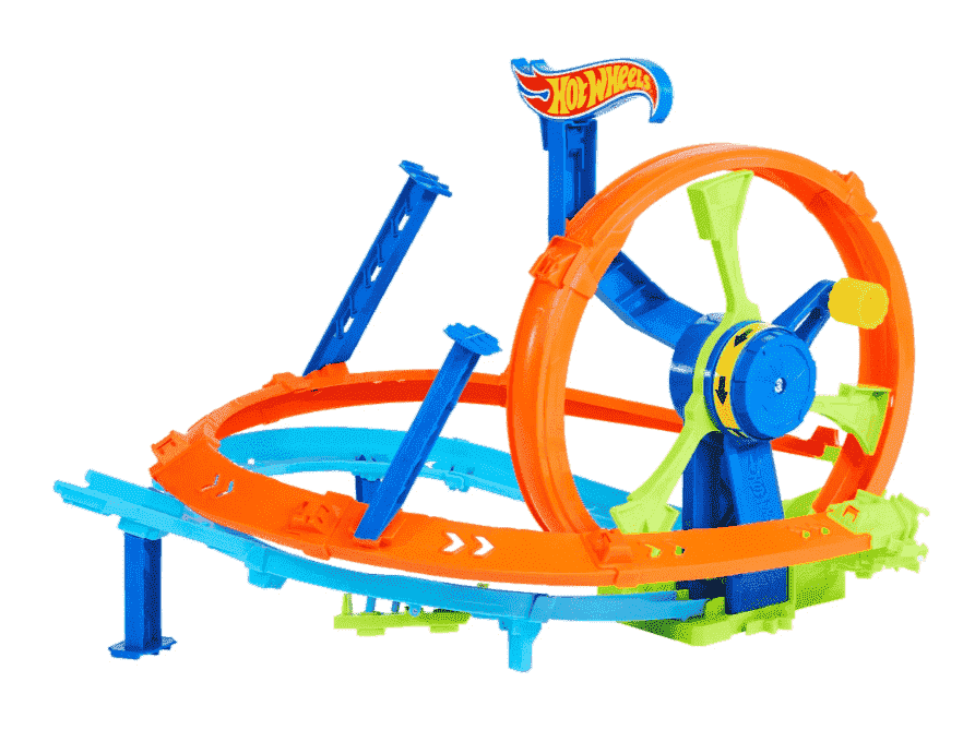 Il playset Hot Wheels Rapid Launch & Loop è dotato di una ruota a manovella che spinge le macchinine ripetutamente attraverso un loop, curve e una zona di collisione!