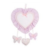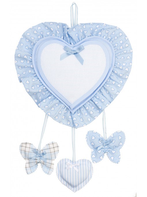 Fiocco nascita a forma di cuore in tela aida da ricamare, contornato da una rouche in piquet di cotone stampato cuoricini con tre pendagli (due a forma di farfalla, uno a forma di cuore) e un'asola in raso per appenderlo. È un delizioso fiocco nascita in tessuto da appendere a muro o alla porta di casa per annunciare la nascita di una nuova vita. Il fiocco è realizzato in cotone, la tela aida è applicata sopra un cuoricino in piquet tinta unita, imbottito con ovatta di poliestere. Una rouche in piquet di cotone stampa cuoricini corre tutto attorno al cuore. La tela aida 55 fori, sollevabile dal corpo centrale, misura nel punto più largo 15x12 cm. Dal fiocco scendono tre pendagli, uno a forma di cuore, due a forma di farfalla, impreziositi da piccoli fiocchi di raso in tinta. Questo tipo di aida è la più utilizzata dalle ricamatrici abituali ma è perfetta anche per chi vuole approcciare per la prima volta il punto croce. MADE IN ITALY