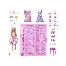 Include oltre 25 outfit e accessori, come abiti, scarpe, collane e tantissime borse! Da un adorabile completo casual con top e gonna a quadri color ciliegia e sneakers a uno splendido abito scintillante con tacchi: c'è un outfit per ogni occasione! Per una facile conservazione e trasportabilità, questo set Barbie Dream Closet si ripiega, così le piccole amanti della moda potranno portare il divertimento e lo stile ovunque.