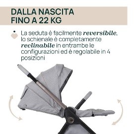La sua struttura, una volta chiusa, resta in piedi autonomamente e presenta una comoda maniglia per il trasporto. Omologato dalla nascita fino a 22 kg. La seduta è facilmente reversibile, lo schienale si reclina in entrambe le configurazioni ed è regolabile in 4 diverse posizioni con una sola mano.