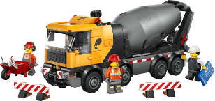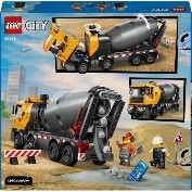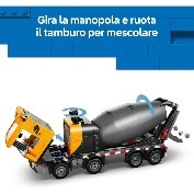 Questa dettagliata betoniera con 8 pneumatici in gomma è dotata di un grande tamburo con sistema a vite di Archimede. I bambini possono ruotare una manopola per mescolare e versare il cemento LEGO sulla condotta di scarico regolabile, proprio come nella realtà.