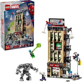 Scopri quattro piani di azione da supereroi con Spider-Man contro Mysterio: Daily Bugle (76342) per bambini e bambine dai 10 anni in su. Questo giocattolo costruibile di Spider-Man collezionabile è ricco di minifigure LEGO® Marvel e avventure di gioco di ruolo. Questo giocattolo costruibile LEGO Marvel Daily Bugle include le minifigure di Spider-Man, Miles Morales, Ghost Spider, J. Jonah Jameson, Mysterio, Capitan America Venomizzato e Rhino, oltre a 3 bastoni trasparenti e 2 mattoncini trasparenti per creare scene d'azione aeree. Il set include anche un mech Rhino snodabile con cabina di pilotaggio apribile. L'interno dettagliato include uffici, reception, tecnologia della redazione, cassaforte e una leva per cartelloni pubblicitari funzionante. L'esterno include una scala antincendio, un'edicola mobile e un angolo di strada con semafori.