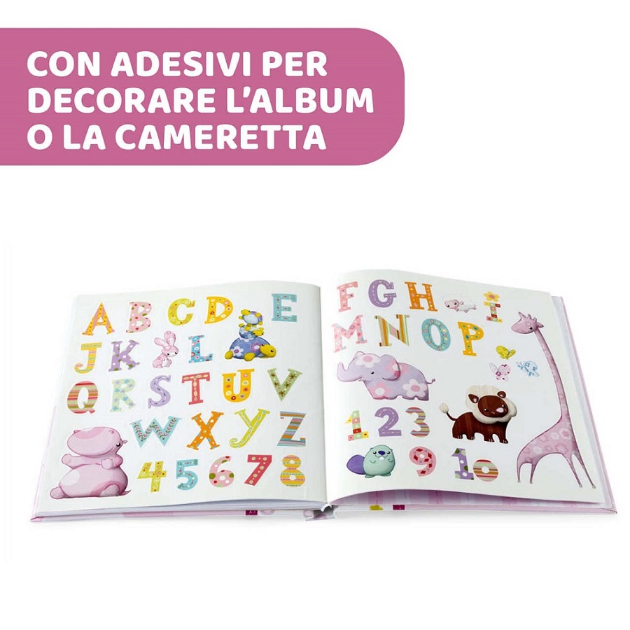 Chicco Libro Ricordi ha tante pagine per custodire le fotografie e annotare i ricordi più preziosi e all’interno divertenti adesivi per decorare l’album o la cameretta e il metro muro per seguire giorno dopo giorno la crescita del bambino. Colore rosa.