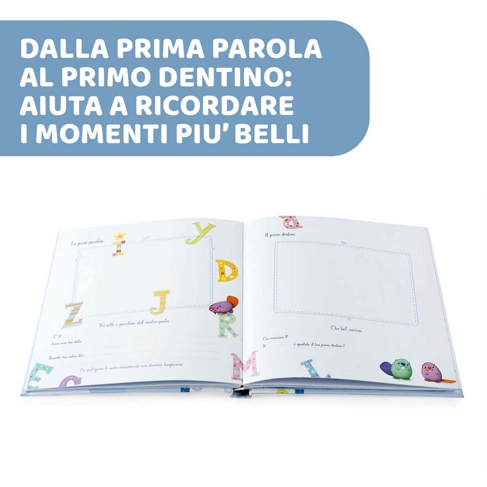 Chicco Libro Ricordi è l'album per conservare i ricordi più preziosi: dalla gravidanza al primo compleanno, seguendo gli eventi più importanti del primo anno della vita del bambino, la prima pappa, il primo sorriso, i primi passi. Con divertenti adesivi.