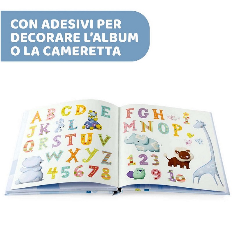 Chicco Libro Ricordi ha tante pagine per custodire le fotografie e annotare i ricordi più preziosi e all’interno divertenti adesivi per decorare l’album o la cameretta e il metro muro per seguire giorno dopo giorno la crescita del bambino.