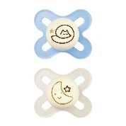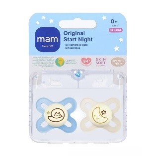 Il piacevole effetto luminoso del bottone del ciuccio 0-2 mesi Original Start Night è dovuto a un pigmento che si carica naturalmente durante il giorno e restituisce la luce per ore. Il ciuccio MAM è progettato in collaborazione con i dentisti e la sua tettarella piatta e simmetrica si adatta alla bocca del bambino, per uno sviluppo sano dei denti.