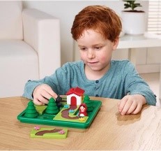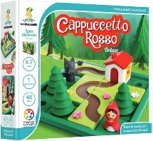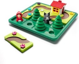 Il bambino sceglie sul libretto uno schema da realizzare, sistema Cappuccetto Rosso, la casa e gli alberi sul tabellone, utilizza i pezzi del puzzle per fare un percorso che arrivi a casa della nonna più velocemente del lupo. La scatola contiene: 1 tavoletta gioco, 1 Cappuccetto Rosso, 1 lupo, 1 casa della nonna, 3 alberi, 5 pezzi sentiero, 1 libretto con 48 sfide (24 con il lupo, 24 senza) e 48 soluzioni, 1 libro illustrativo.