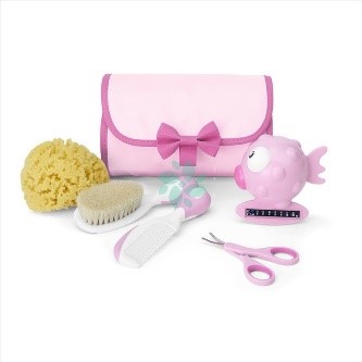 Composto da un pettine, una spazzola morbida, termometro, spugna naturale e un paio di forbici