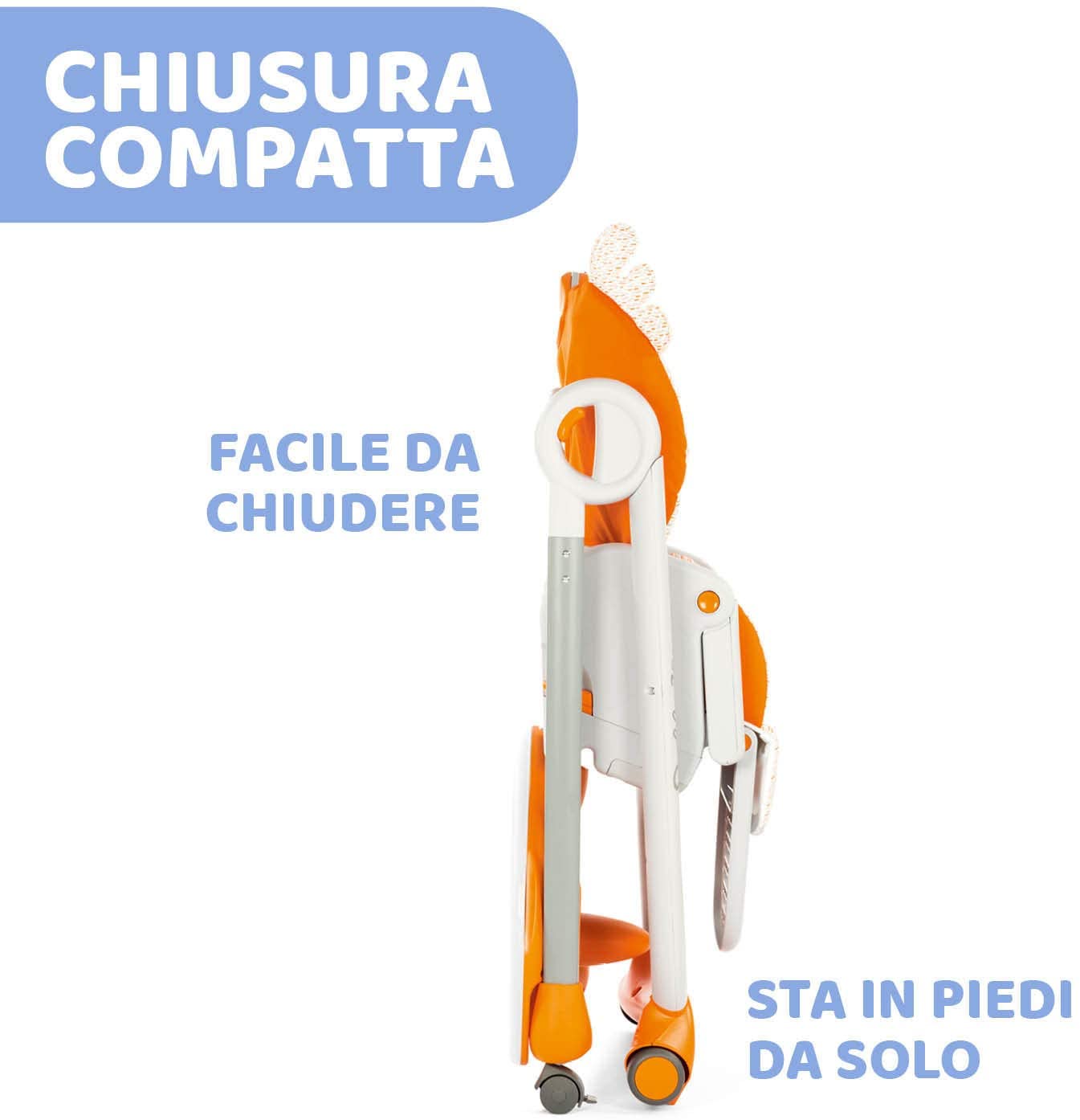 - 4 RUOTE: Il seggiolone può essere spostato senza problemi per affiancarlo al tavolo o cambiarne la posizione sia da aperto che da chiuso, grazie alle 4 comode ruote, 2 delle quali piroettanti e bloccabili