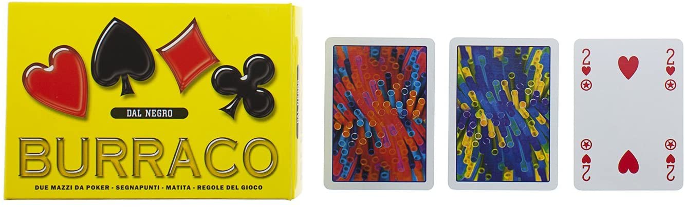 Carte da gioco dal Negro, prodotte in Italia nel Trevigiano. Burraco giallo composto da 2 mazzi e scheda segnapunti.